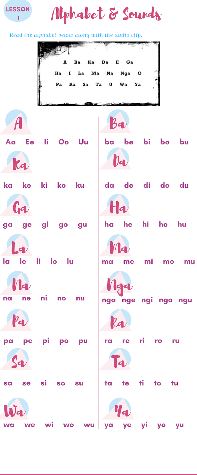 The Filipino alphabet is is composed of VOWELS and CONSONANTS. Get yourself familiarize with it as it will be helpful in our next lesson.