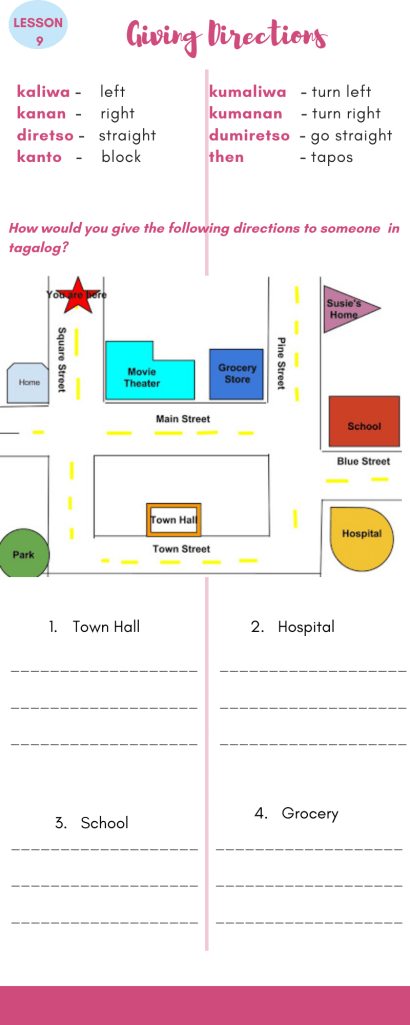 For example, Lakad ka sa Church, pagkatapos kaliwa ka or kumaliwa ka sa ____. :)Now you can begin.
