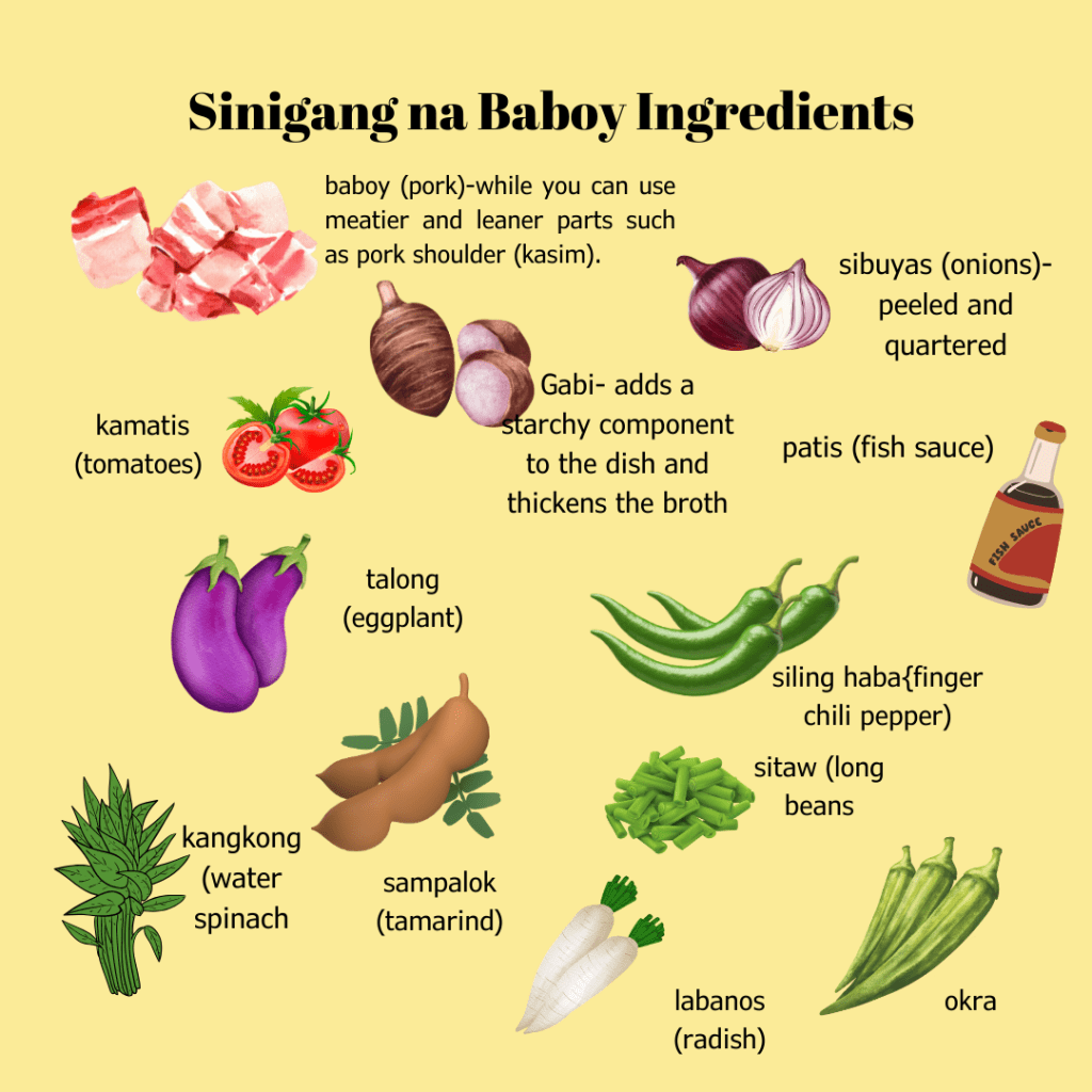 From the article, “Kawaling Pinoy, posted last January 2023, it is mentioned the definition of Sinigang. Sinigang is a classic Filipino soup character by its sour and savory medley of flavors. It’s popular comfort food in the Philippines, usually served on it’s own or paired with steamed rice on rainy days to ward off the cold. The term sinigang describes a cooking method more than a particular dish, as it has many variations. It can be made with protein such as pork, fish, shrimp, beef and chicken. (See reference:https://www.kawalingpinoy.com/sinigang-na-baboy/)